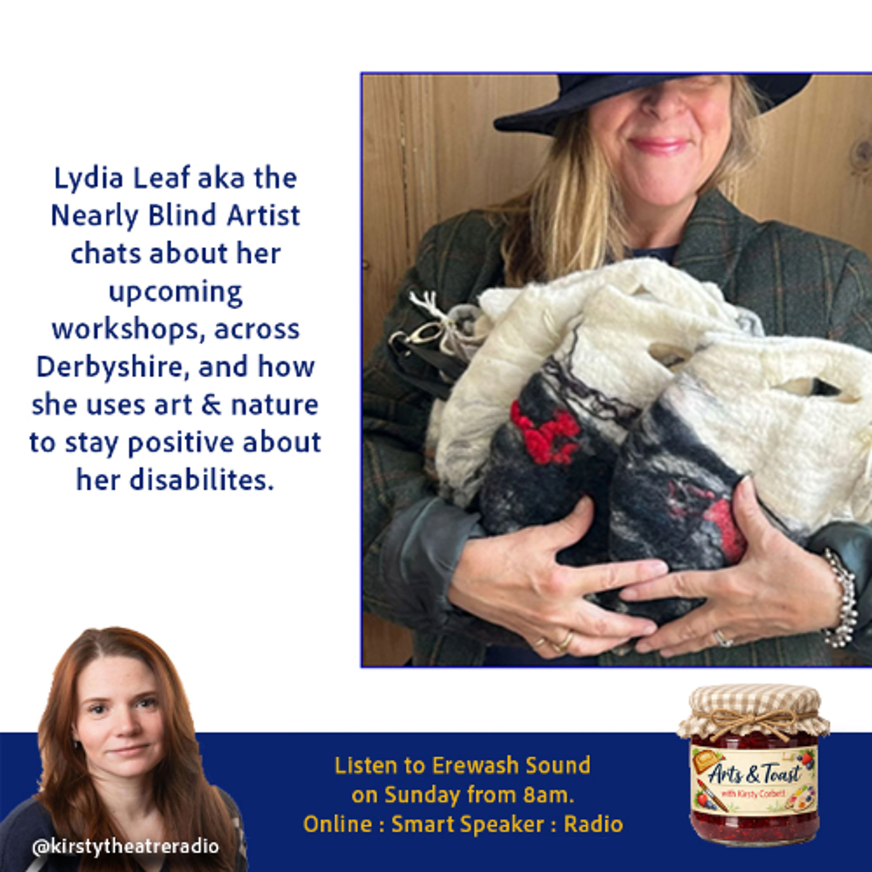 Lydia Leaf aka the Nearly Blind Artist was diagnosed with a rare skin disease that took over her eyesight in her late 40s. Lydia, a trained teacher, from Ilkeston is now working with local projects such as Make/Shift & Access to Work to continue her career as a professional artist and community workshop leader.